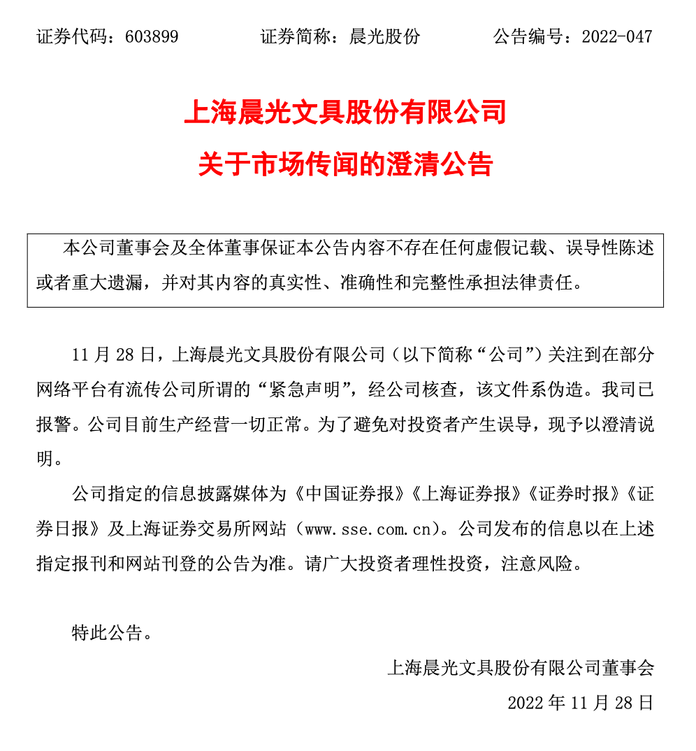 晨光股份11月28日公告,公司关注到在部分网络平台有流传公司所谓的“紧急声明”,经核查,该文件系伪造,公司已报警。公司目前生产经营一切正常,为了避免对投资者产生误导,现予以澄清说明。