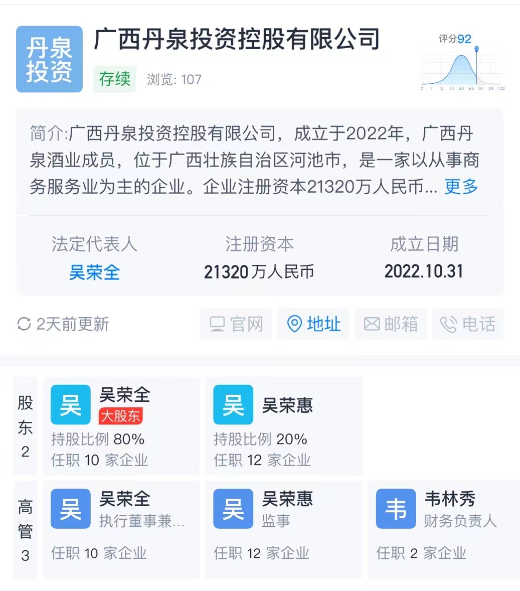针对新成立的公司,界面新闻登录天眼查获悉,丹泉投资控股成立于2022年10月31日,注册资本2.132亿元。从股权结构来看,目前吴荣全为该公司第一大股东,持股比例为80%。此外,广西丹泉集团实业有限公司总经理吴荣惠持股20%。