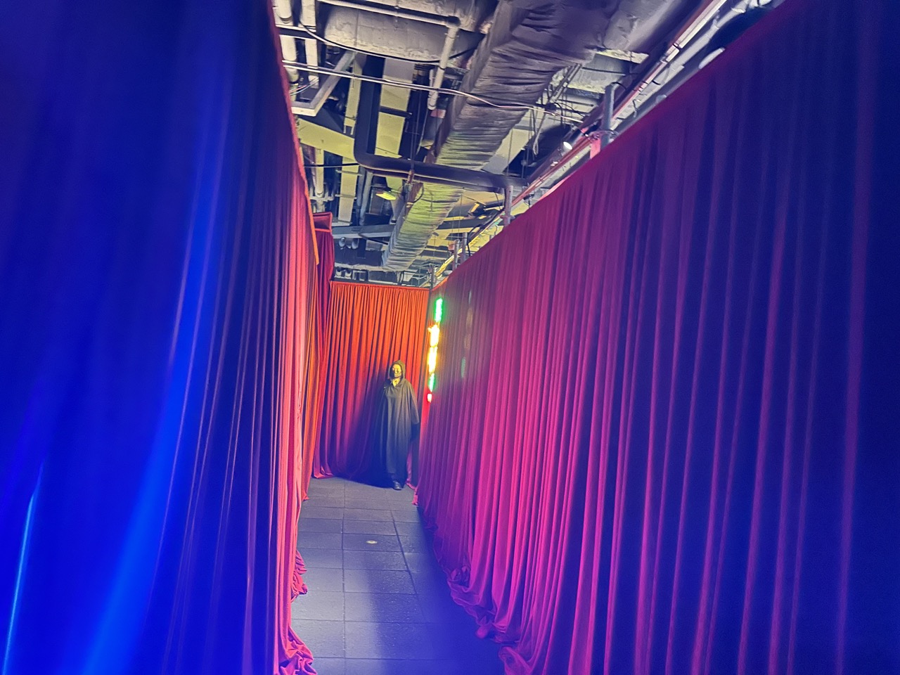 “簋市”在设计上采用了微恐密室的形式,入口处布置了红黑色调的幕布,工作人员也统一身着黑袍。整个空间按照折扣力度分为四件68折、55折、2折几个区域。