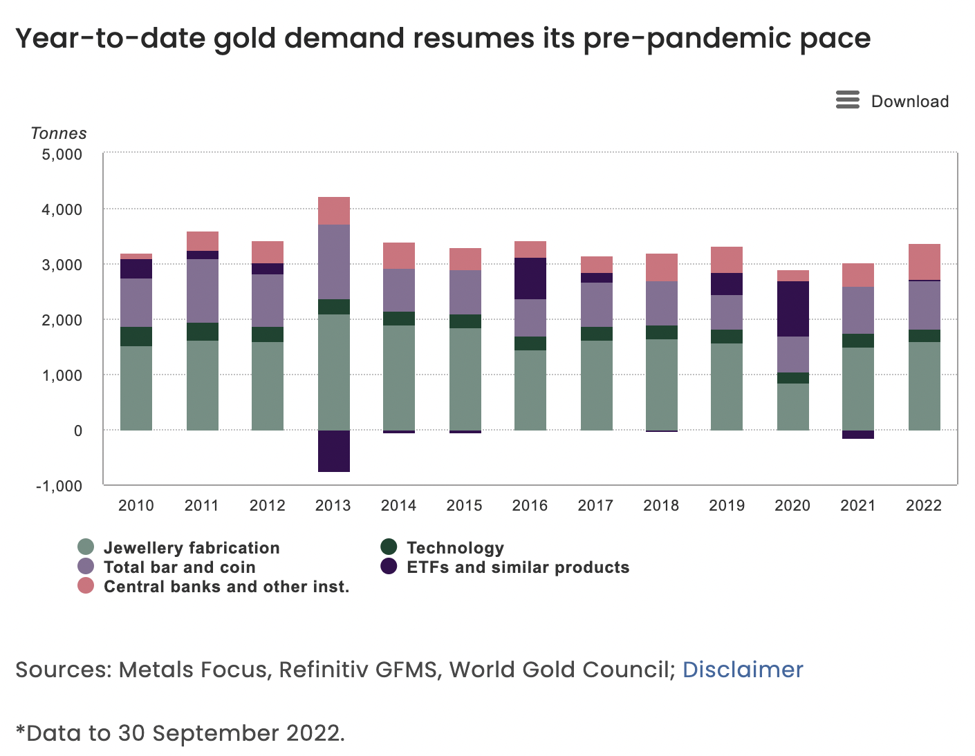 据世界黄金协会 (WGC) 的一份新报告,今年前三季度,黄金需求(不包括场外交易)同比增长28%,达到1181吨。这与2021年同期相比增加了18%,已恢复到大流行前的水平。与此同时,黄金总供应量小幅增加,同比增长1%,达到1215吨。