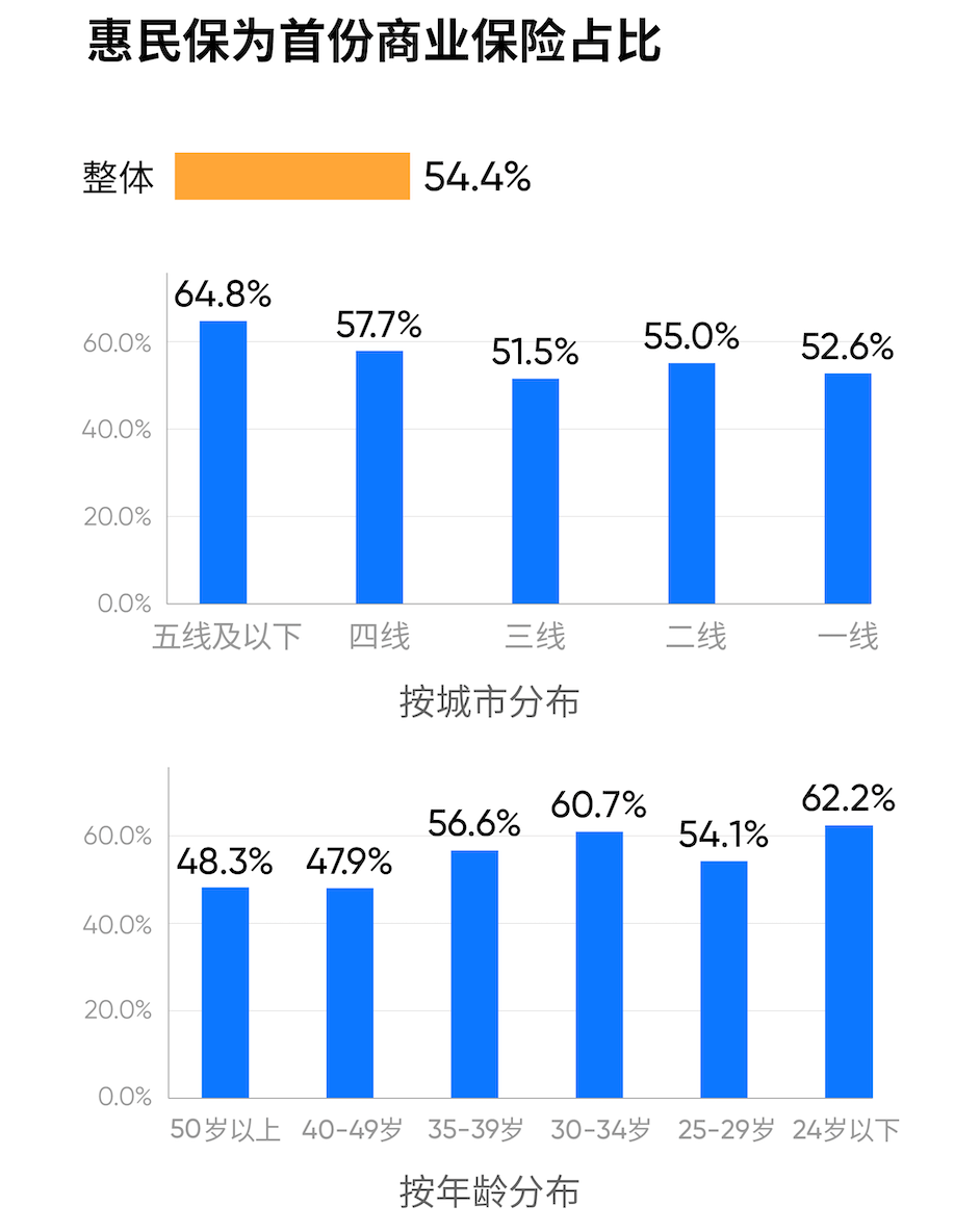 《报告》显示,在现有惠民保用户中,有54.4%的用户购买的第一份商业保险就是惠民保,这表明,惠民保对保险市场有一定的教育意义。这个趋势尤其在下沉市场中更为明显,在五线及以下城市的惠民保用户中,有64.8%的用户是首次购买商业保险。