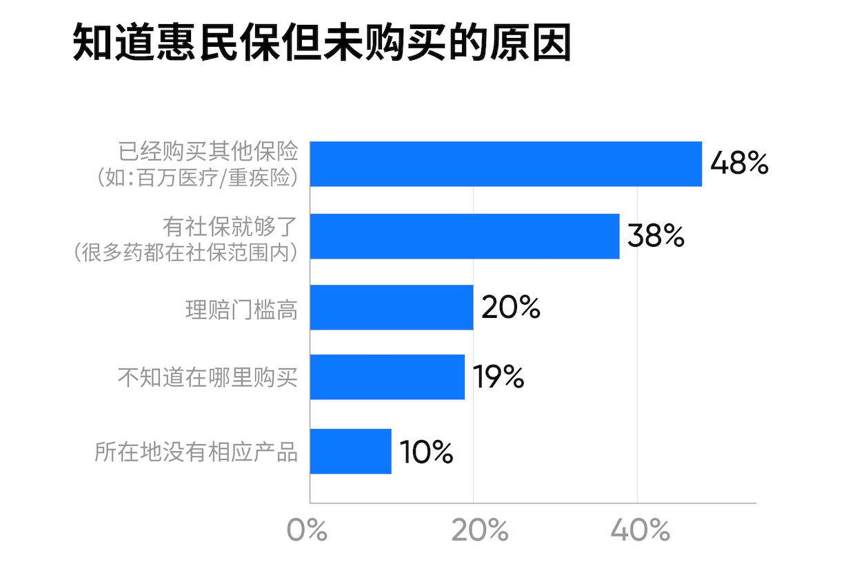 在未购买惠民保的用户中,近一半用户是因为已经购买了百万医疗、重疾险等其他保险,还有近四成用户认为“有社保就够了”,20%的用户因为理赔门槛较高。此外,数据显示,有19%的用户不知道在哪里购买惠民保产品,以及有10%的用户所在地没有相应的惠民保产品。