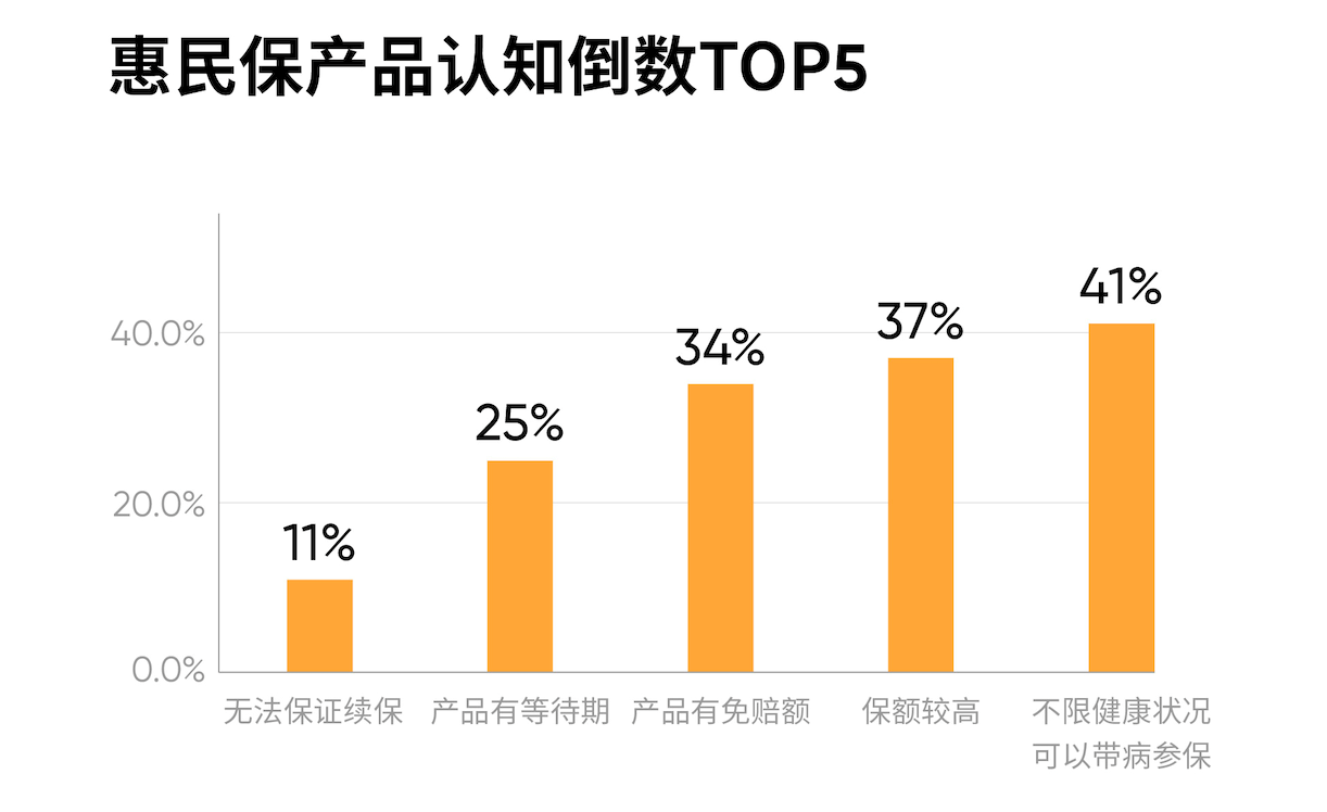 值得关注的是,虽然近年来惠民保发展迅速,但用户对产品认知仍存在不足。《报告》显示,从产品理解程度来看,用户对免赔额、等待期、无法保证续保的认知程度较低,只有11%的用户了解惠民保无法保证续保,仅25%和34%的用户了解产品是否有等待期及免赔额。
