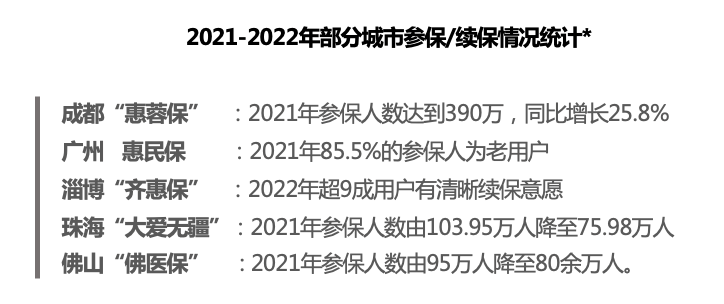 据公开数据显示,“惠民保”参保率持续提升,2021年上市的项目参保率为9.1%,较2020年整体4.2%的参保率提高4.9个百分点,同比增长116.67%。具体来看,各地续保情况有升有降,存在较显著差异,有部分产品因保障条款设置创新力不足、宣传力度不足等因素,续保率存在下降现象。也有部分城市通过不断调整产品保障力度,提升续保率。