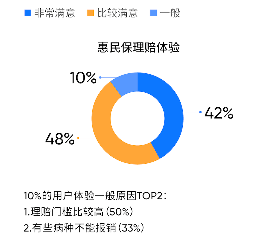 数据显示,在水滴调研用户中,理赔满意度达90%,48%的用户对理赔非常满意,42%的用户比较满意,10%的用户理赔满意度较低,主要因为理赔门槛高,有些病种不能报销,占比分别为50%和33%。