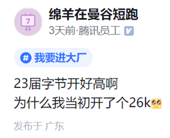 穆胜咨询通过调研发现,很多互联网大厂员工对于薪资倒挂感到焦虑和不安。一位现腾讯、前字节员工吐槽:“23届字节开好高啊,为什么我当初开了个26k。”评论也是各抒己见:“这个时候能进去的,水平肯定很强的”“不用羡慕,起点虚高,后面职业生涯都是在降薪中煎熬”。