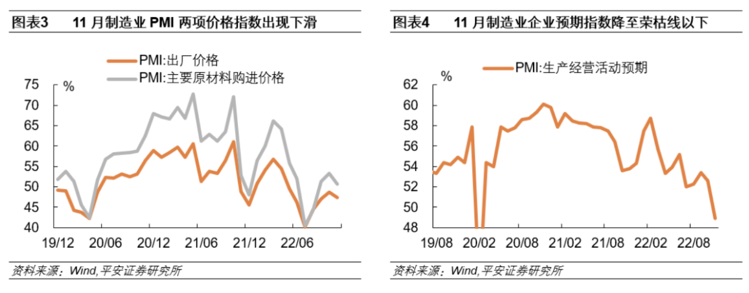 第四,制造业企业市场预期大幅转弱。11月制造业PMI生产经营活动预期指数环比下降3.7个百分点至48.9%,为2022年2月以来首次跌至荣枯线以下,市场信心明显转弱。从行业看,纺织、化学原料及化学制品、黑色金属冶炼及压延加工、金属制品等行业生产经营活动预期指数均低于43.0%,企业信心不足的情况更为明显。