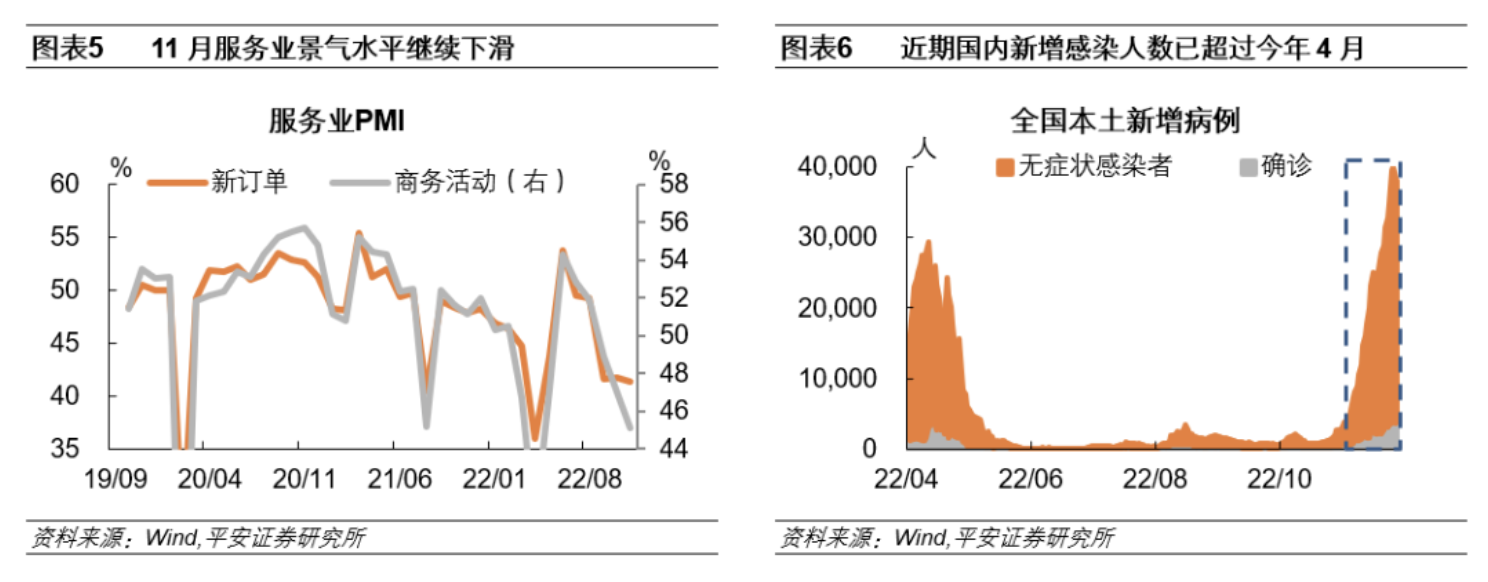 第五,服务业景气水平连续五个月下降。11月国内疫情形势更加严峻,11月29日全国单日新增感染人数已超3.7万人、超过4月全国性疫情单日新增感染高点。在此背景下,11月服务业PMI商务活动指数进一步走低,环比回落1.9个百分点至45.1%。其他分项指数中,除销售价格指数小幅回升外,新订单、业务活动预期、从业人员等指数均出现了不同程度的下滑,尤其是从业人员指数降至2020年2月以来新低,考虑到服务业在我国就业市场的重要性,“稳就业”或面临更大挑战。分行业来看,多数服务业行业均位于收缩区间,国家统计局公布的数据显示,在调查的21个行业中,有15个位于收缩区间,其中道路运输、航空运输、住宿、餐饮、文化体育娱乐等接触性聚集性行业商务活动指数甚至低于38.0%。