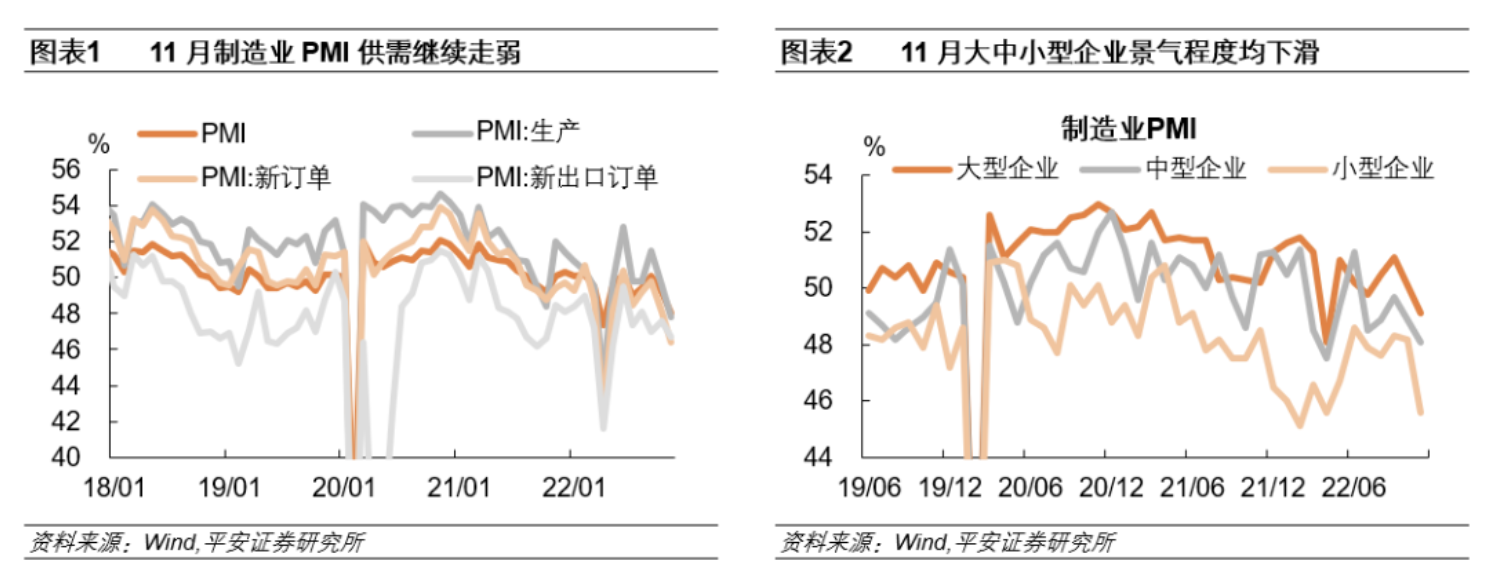 分企业规模来看,各类型企业景气程度均明显回落,尤其是小型企业制造业PMI降至今年4月水平。11月大、中型企业制造业PMI环比分别下滑1.0、0.8个百分点,至49.1%、48.1%,供需两端均明显走弱。而小型企业制造业PMI下滑尤为明显,达到2.6个百分点,11月小型企业制造业PMI为45.6%,与今年4月持平。