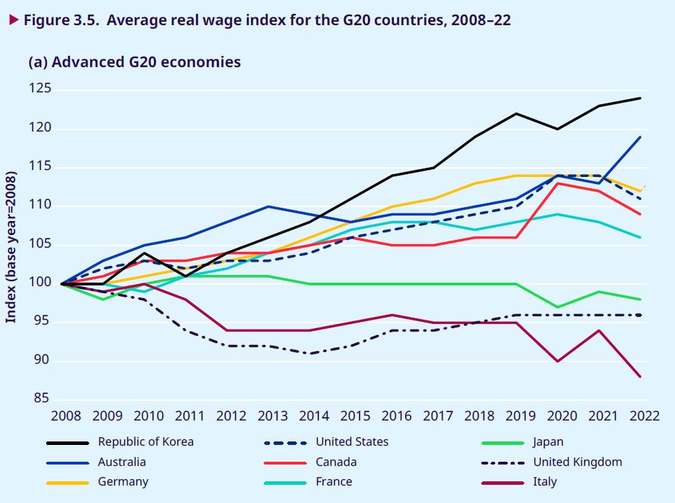 在G20国家中,发达经济体今年上半年的实际工资增长率为-2.2%。其中,英国、日本和意大利三国的实际工资水平甚至比2008年实际工资水平还低。