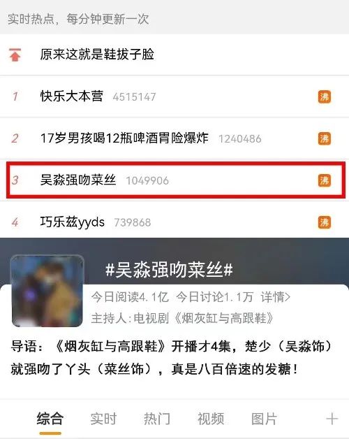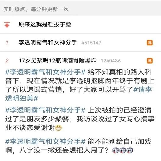 可惜好景不长,#吴淼强吻菜丝#的词条被粉丝怒骂炒cp毫无底线;因艺人方投诉,#李透明霸气和女士分手#热搜被迫下架;因为网友对热搜词条的误解伤害到家人,《天上银河》的男主角发博怒斥剧方,不再配合任何宣传……
