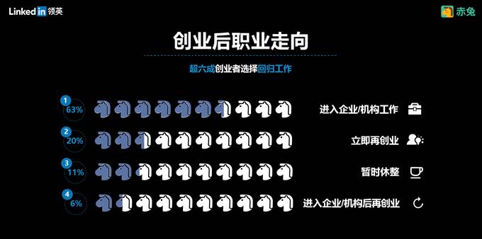 尽管创业的远景美好,但现实依然是骨感的。从总体比例看,创业成功的几率可能连1%都不到,人们看到的往往是那些光鲜的成功案例,但其实绝大多数的创业者却不得不接受失败。领英发现63%的创业者选择回到企业或政府机构重新开始工作,而20%的创业者非常执着,选择立即投入再次创业,而11%的失意者表示休整后再看。