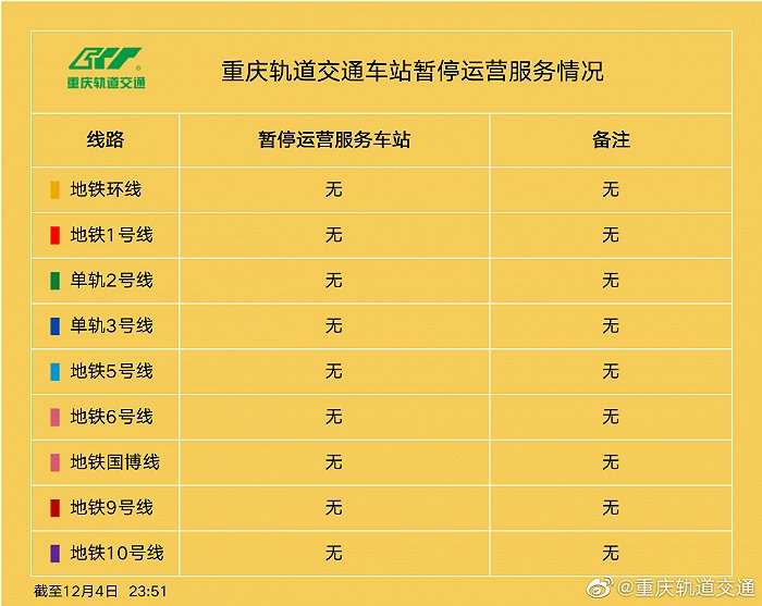 据微博@重庆轨道交通消息,12月5日06:30起,暂停运营服务的车站全部恢复运营服务。