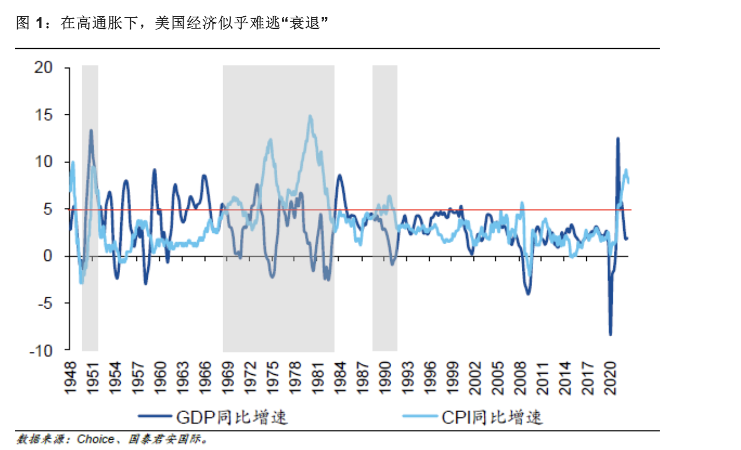 在这个共识的基础上,市场其实博弈的是美国利率是否会在明年的某个时点出现明确的拐点。利率拐点背后显然有另一个更加重要的考量,即在持续加息后,美国经济会在2023年的某个时点陷入“衰退”。从历史上来看,在相对较高的通胀环境下,美国经济都陷入了“衰退”,这也成为本轮美国经济“衰退”的历史寓言。而关于“衰退”时点的市场预期则是明年的第二和第三季度,即明年年中前后。