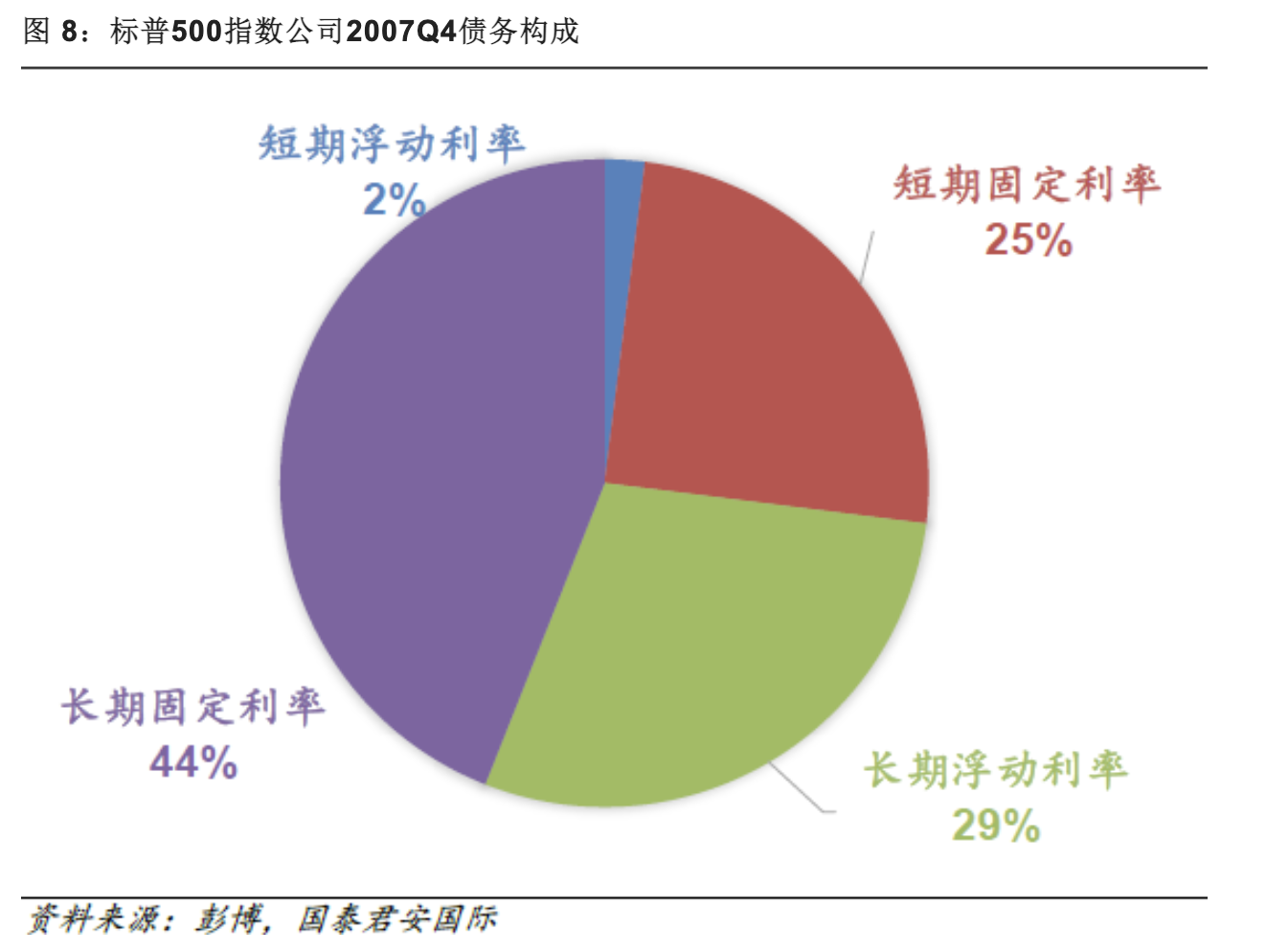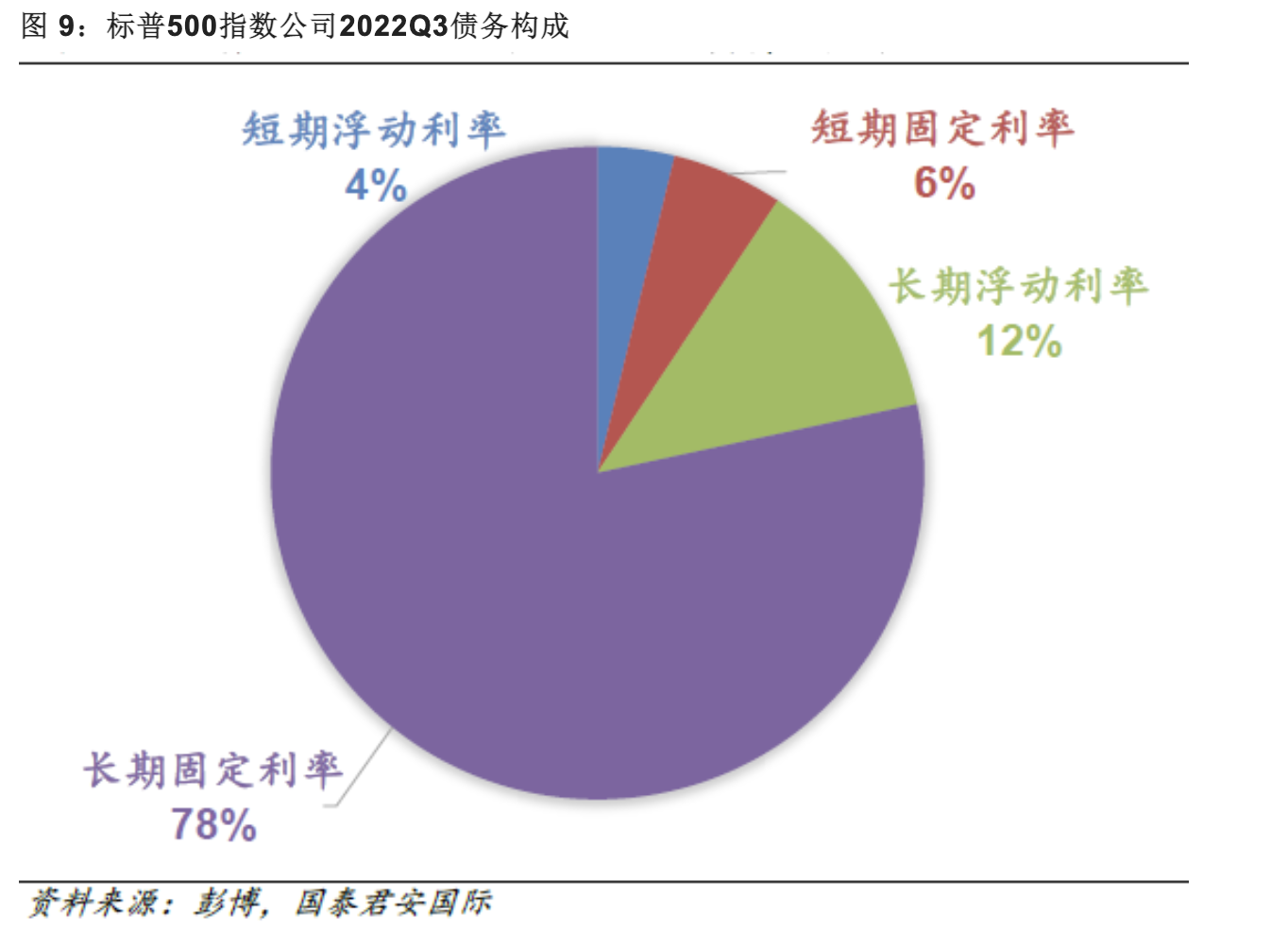 从企业端来看,与上个周期相比,上市公司的债务结构也较为优化,长期固定利率占比较高。我们选取了标普500强的公司作为分析对象,从债务结构组成分解图可以看出,2022年长期固定利率占据上市公司债务比例接近80%,接近2007年两倍。受美联储进一步加息影响更大的浮动利率债务部分,仅占据15%左右。因此,就企业端而言,受益于债务结构的优化,美联储进一步加息对于目前企业端的债务传导压力相对较弱,因此企业端的债务结构改善也相对较为乐观。