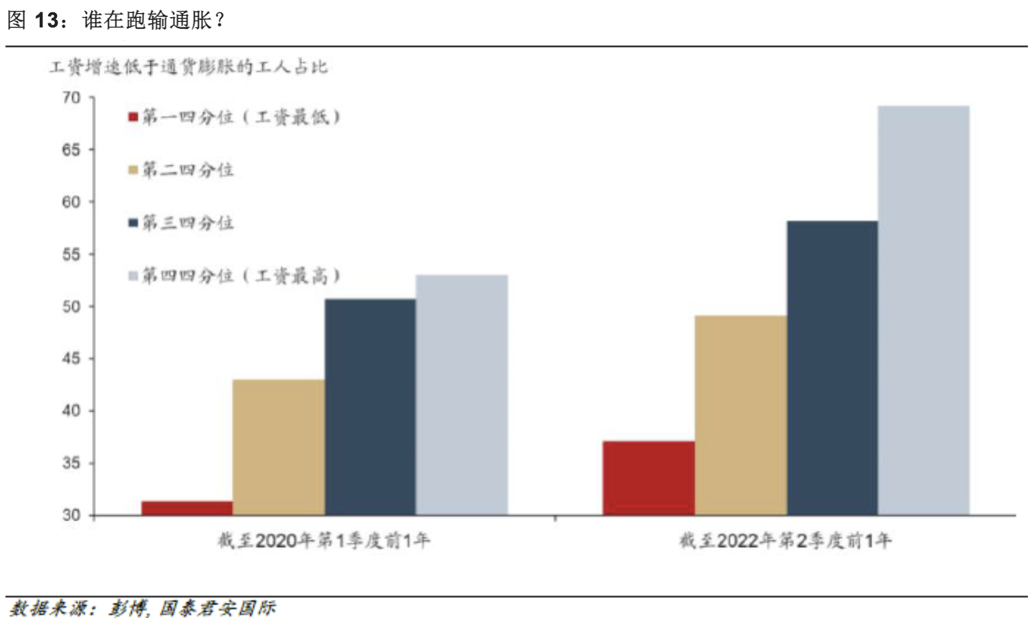 衡量核心通胀的关键因素是工资,而低收入群体面临更大的涨薪压力。我们将工资增速与通胀进行对比,并以工资水平进行群体的区分后,发现在这一轮的通胀中,低收入群体工资增长跑赢通胀水平的概率比高收入群体更高,并且随着收入水平的上升,工资涨幅跑赢通胀的比例不断下降,这表明本轮通胀影响是一个广谱的现象。低收入群体储蓄水平较低,通胀压力下,生活成本上升带了更明显的涨薪压力,这也会带来相关服务业成本的抬升,加剧通胀的粘性。