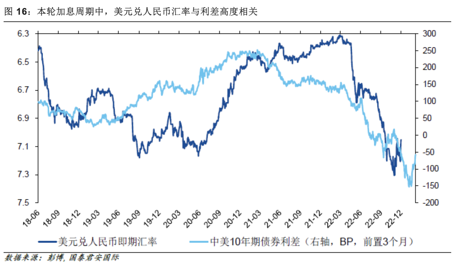 基于这样的判断,我们可以进一步探究金融市场的表现。在本轮美联储加息周期中,美元兑人民币汇率与利差存在着较高的相关性。2022年前三个季度,中美利差倒挂走阔成为了人民币贬值的主要推动力,中美利差也可以在很大程度上作为人民币汇率的先行指标。近期中美十年期债券利率差异开始显露出收敛迹象,这意味着人民币汇率在短期内会呈现出一定的强势。但从中期维度来看,汇率仍然是由经济基本面决定的。
