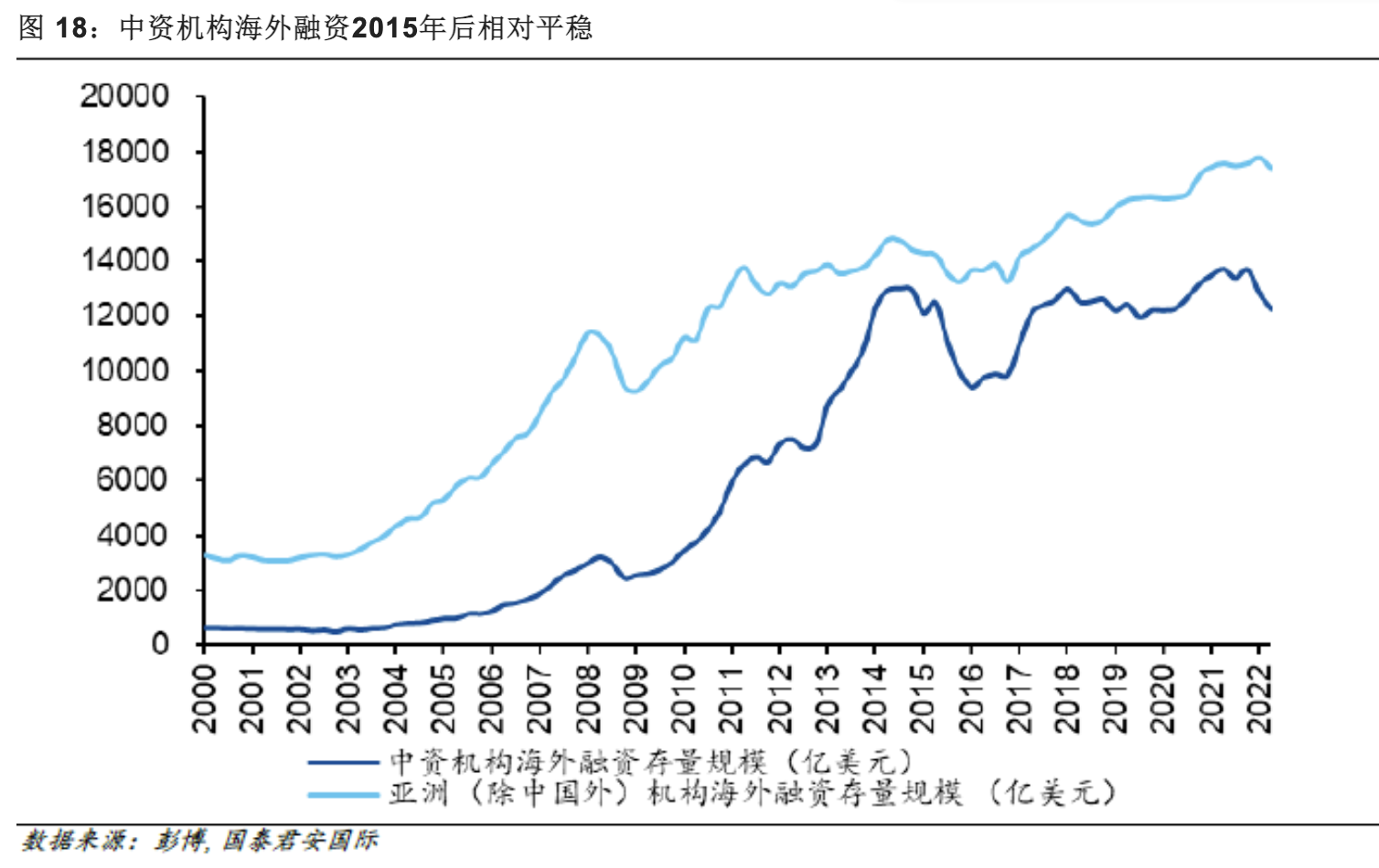 然而,中资机构却可能“借道”香港进行海外融资。2015年之后,香港机构的海外融资存量规模不断上行,在一定程度上反映出中资机构“借道”香港进行海外融资。举例来看,过去几年中大量发行的中资美元债,其中的一部分可能被外资机构持有,从而体现为香港机构的海外融资。未来一段时间,中资美元债的到期规模仍然较大,在高利率环境下,如何获得“再融资”值得市场关注。当然,我们已经在政策面看到一些正面迹象,比如说近期有消息称四大国有银行开始为房企提供以国内资产作为抵押品的境外贷款,以帮助房企偿还海外债务。