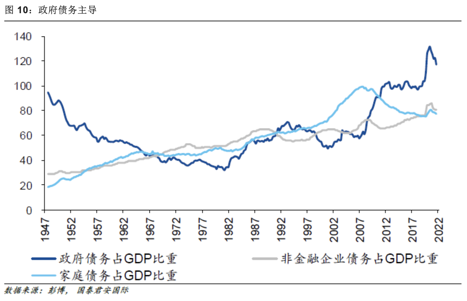 整体来看,美国正处于政府加杠杆,居民去杠杆的进程中。从政府端来看,联邦政府福利支出使得政府负债处于相对高位。自疫情以来,政府的财政对居民和企业进行了较大力度的支持,支出压力也因此转移至政府端。自2008年以来,按照GDP比重计算,居民和非金融公司的债务整体处于下滑的区间。同时,虽然公共债务整体相对上行,但美国政府强大的融资能力使得政府债务风险相对较低,总体风险不高。