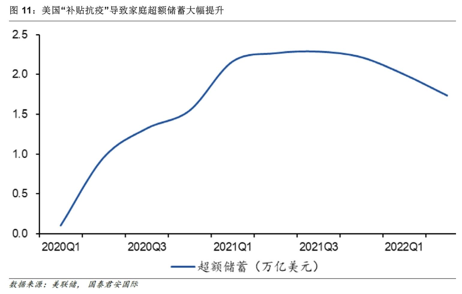 “需求侧”因素进一步推高了通胀。另一方面,疫情期间美联储的补贴措施推动了美国整体居民可支配收入水平的提升,形成了大量的“留存储蓄”,同时也在疫情后推动消费支出的快速增长,这则是导致通胀持续上升的“需求侧”因素。但即使补贴消退,后疫情时代美国相对较高的家庭储蓄率也仍在持续推动消费水平的上升。