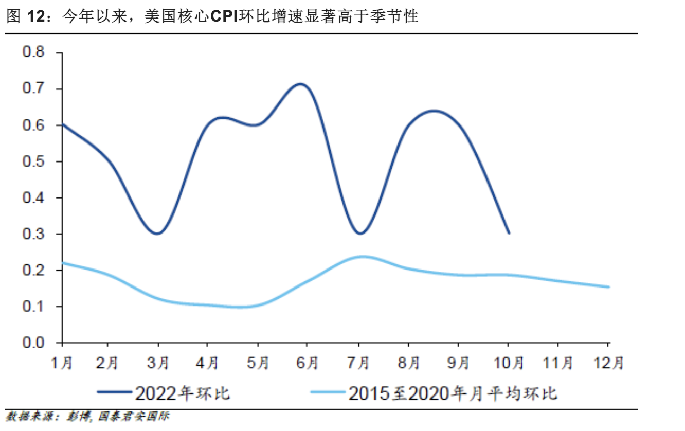今年以来,美国的核心CPI也一直明显高于季节性的表现,表明通胀存在较强的“粘性”。今年前10个月的CPI环比平均增速为0.51%,对应年化水平约为6%,也意味着核心CPI距离2%左右的“合意区间”仍然有相当的距离。