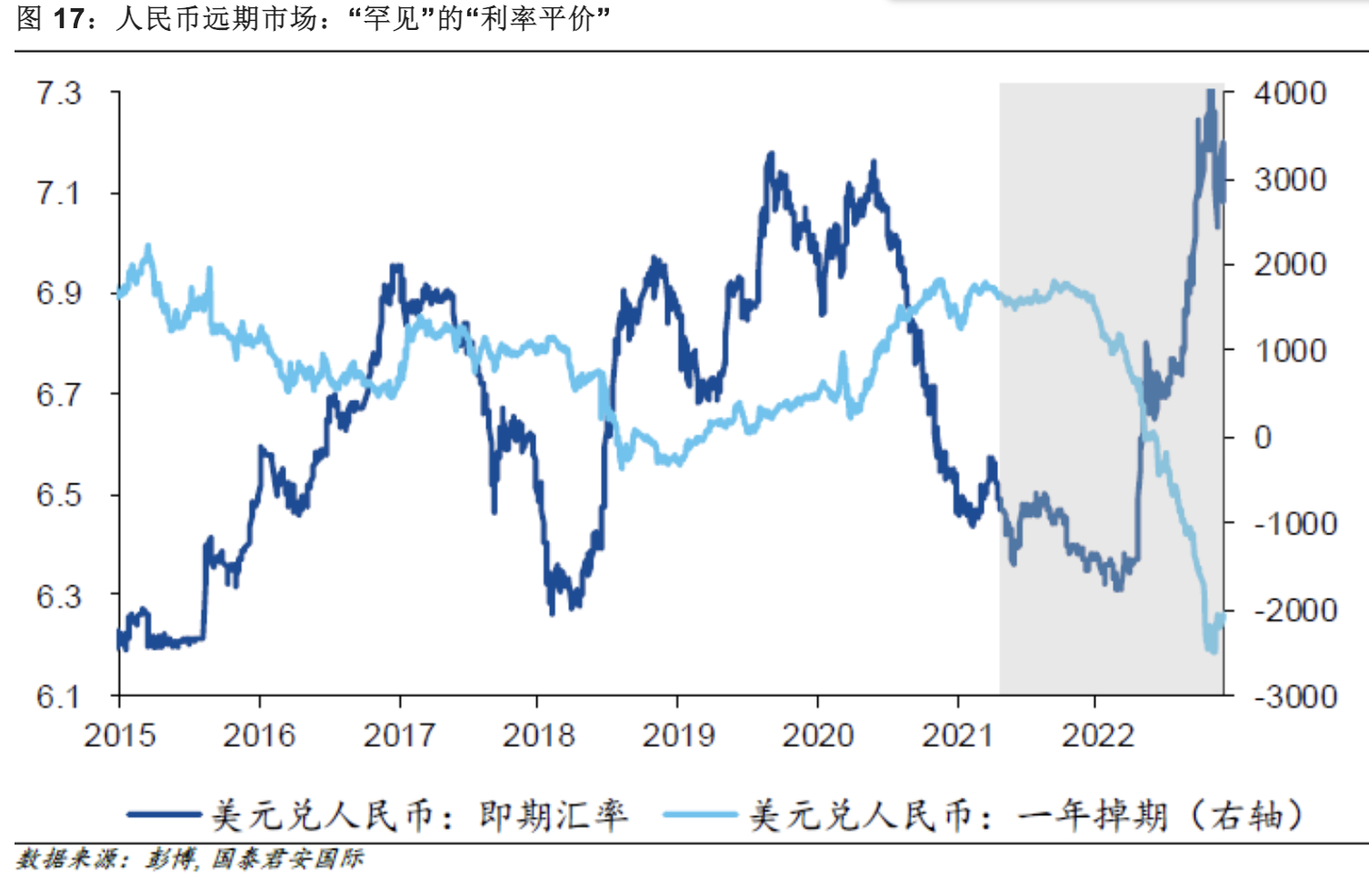 衍生品市场可以更好地解释“利差主导”。2015年以来,外汇远期市场曾经多次出现“利率不平价”的情况,这在人民币贬值时表现得更为明显。一方面,人民币的即期汇率在贬值,另一方面,远期汇率也出现了较为明显的贬值预期。虽然从理论上来说,人民币利率高于美元,掉期点数理论上应该为正,但是掉期点数经常在人民币即期汇率贬值时出现快速的上行,同时显著超出“利率平价”预示的位置。但在本轮人民币贬值的过程中,远期市场出现了掉期点数的快速下行,其走势与中美利差走势大致相仿。换言之,本轮人民币的贬值,基本是由“利差”在主导,抑或说市场没有强烈的单边预期。我们预计,“利差”仍将在一段时间内主导汇率市场。