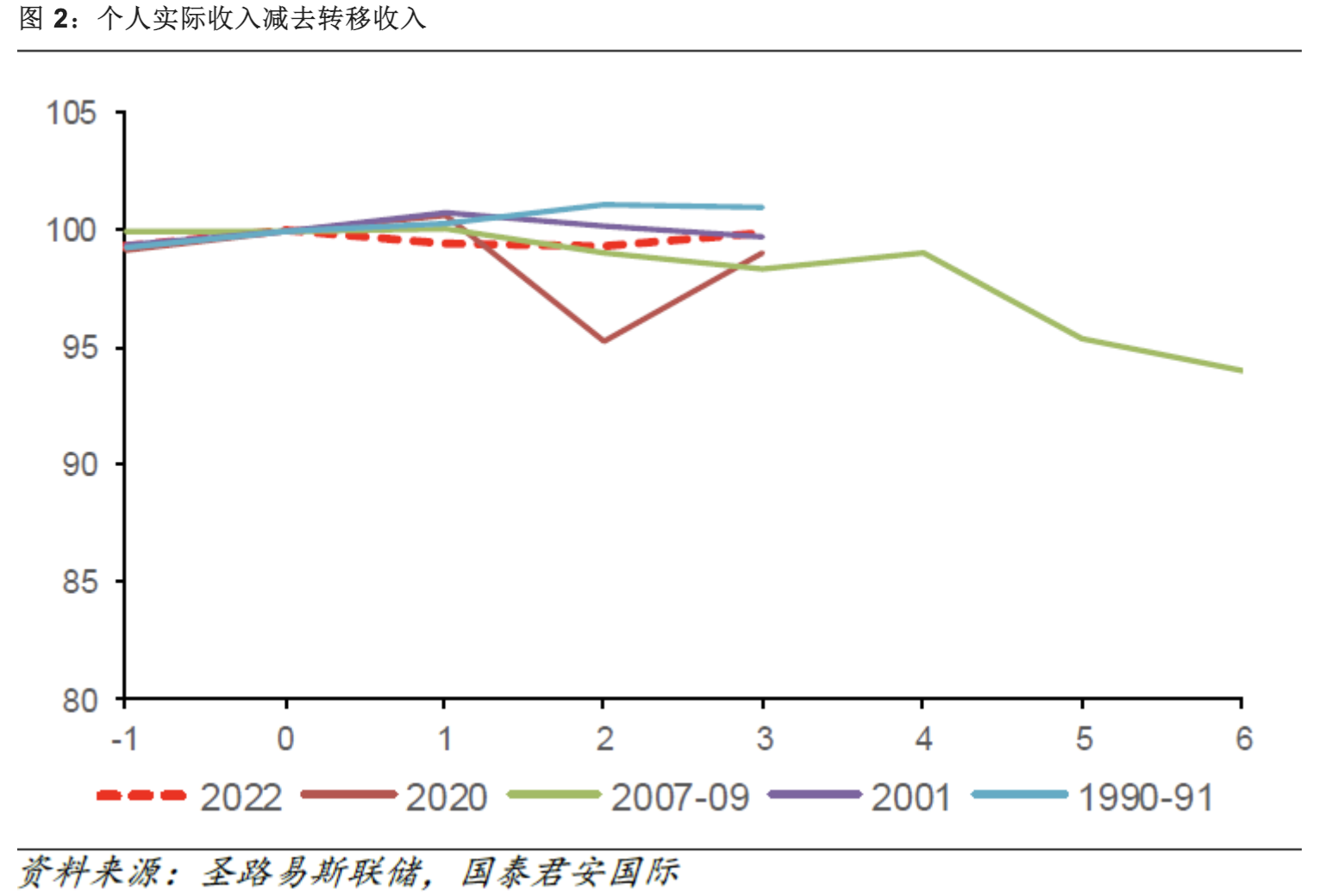 从个人收入的角度分析,美国尚未出现衰退的迹象。消费的良性增长很大程度来自于居民收入的推动,而为了缓解疫情带来的压力,美国提高了福利以及补贴的力度,在增加居民支配收入同时也促进消费,以此拉动经济增长。但在衡量劳动力收入指标时,将联邦政府的转移收入剔除后,我们会得到一个对于劳动力市场更加直接的收入反馈。从下图中,我们可以明显看出,目前来看,个人收入减去转移收入后的实际收入仍然处于正常区间。