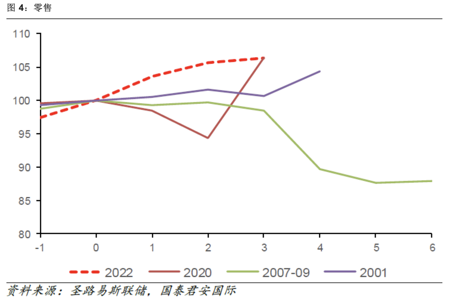 衡量经济市场是否衰退,我们先选取历史的维度。我们选取了四个经济数据:个人收入、非农业就业、零售以及工业产出,与此前的四个衰退周期进行对比。总体而言,目前的经济数据仍然运行在正常区间内。