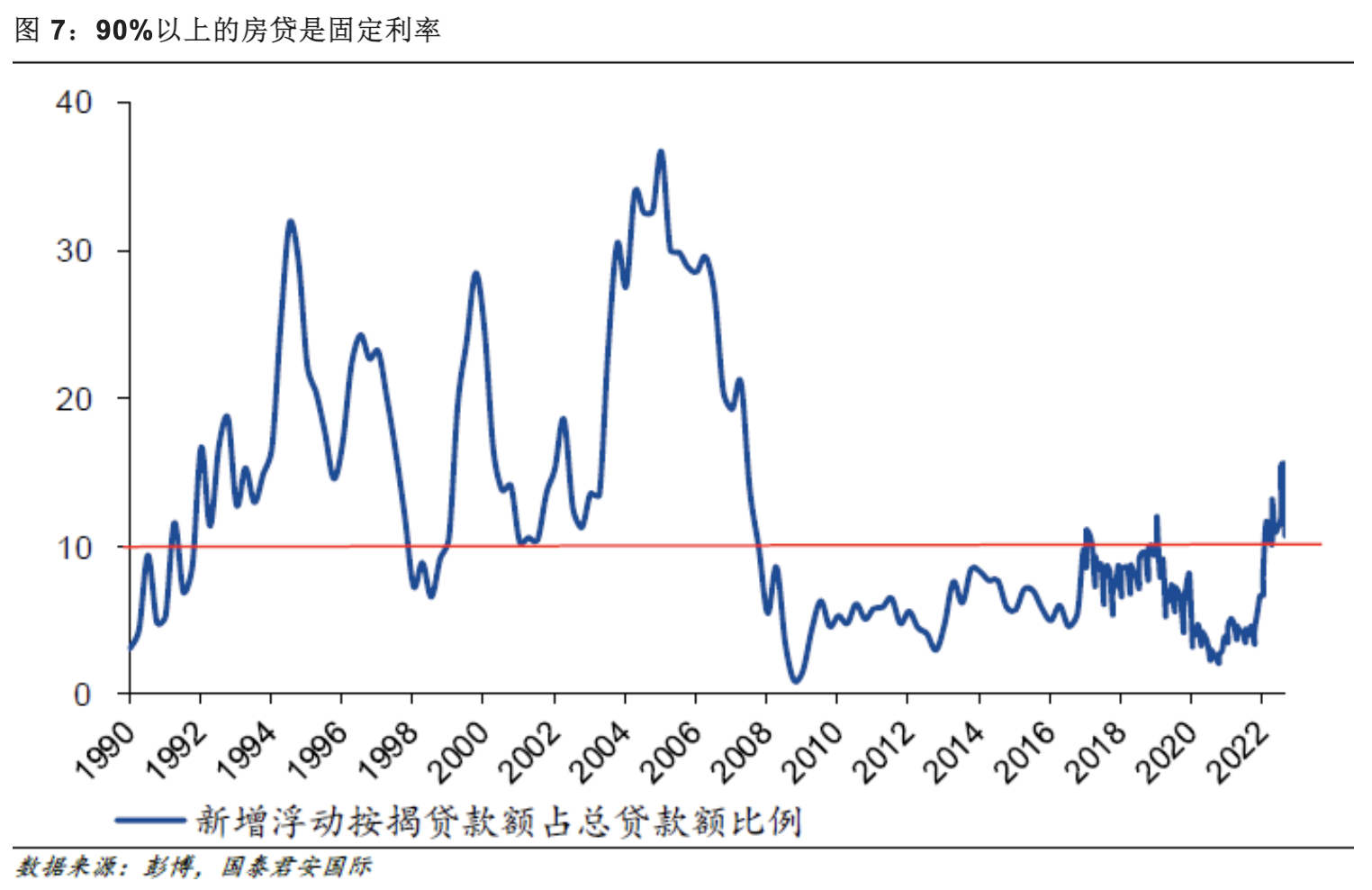 美联储加息也引发了对于房地产贷款市场的担忧。自2008年以来,固定利率成为房贷的主流选择,浮动贷款利率占比较低。目前虽然新增浮动按揭贷款占总贷款的比例自本轮加息以来有相对上升,但是整体仍处于历史低位。考虑到固定利率贷款受美联储加息影响较小,所以在目前大多数(90%)贷款为固定利率的情况下,美国房地产市场波动会相对较小。