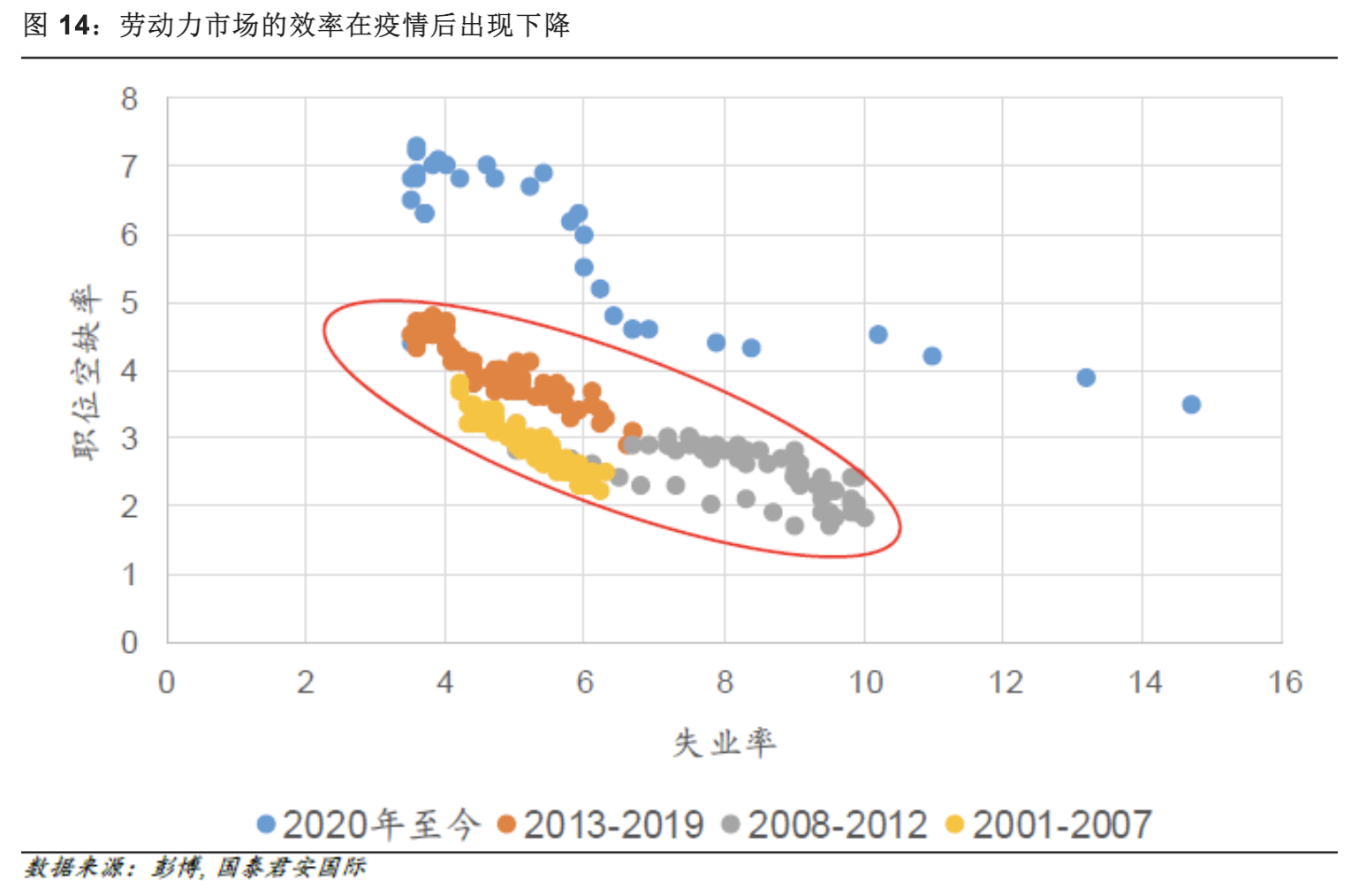 这样的相关性在疫情爆发后似乎出现了新的变化,曲线的整体外移成为了一个新的特征。这意味着劳动力市场的效率开始出现下降,即企业需要更长的时间才能找到合适的雇员。为便于分析,我们将疫情后的美国就业市场划分为以下三个阶段: