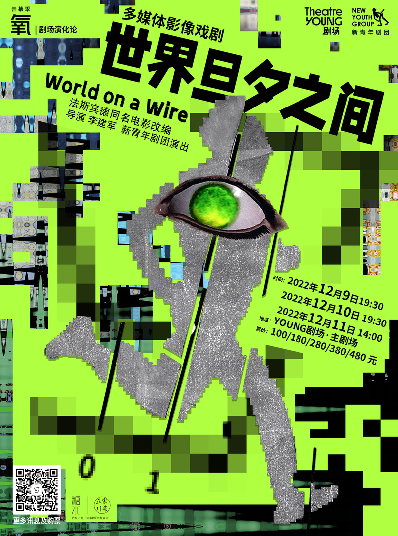 多媒体影像戏剧《世界旦夕之间》改编自上述电影,导演李建军擅长创新性地结合影像与现场表演。在本剧中,他借助即时投影与绿幕抠像技术,打破了舞台时空与地域的限制,将上世纪70年代的电影展现在舞台上。观众的视线将在屏幕和舞台两者之间来回穿梭,这个设计本身即暗示了原作质询何为真实、何为虚假的寓意。《世界旦夕之间》是2021年乌镇戏剧节特邀剧目,这是该剧首次在上海上演。