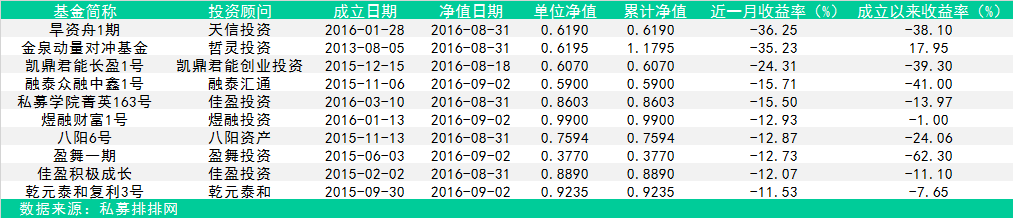 盛光之下,必有阴影。上图显示的十只产品需要私募投资者警惕。这些产品不仅8月份月度收盘在同类产品中垫底,而且绝大部分产品的收益率只成立以来仍处于亏损状态。