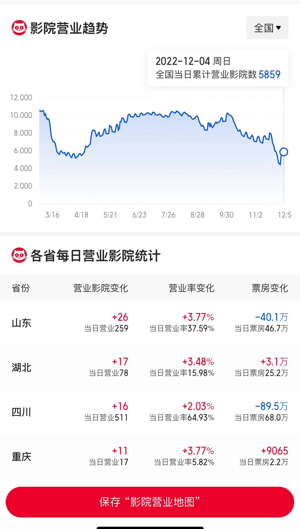 全国影院营业数据正逐步回暖。猫眼专业版数据显示,截至12月4日24点,全国营业影院总数为5858家,总体影业率为47.15%,当日票房约2840万。