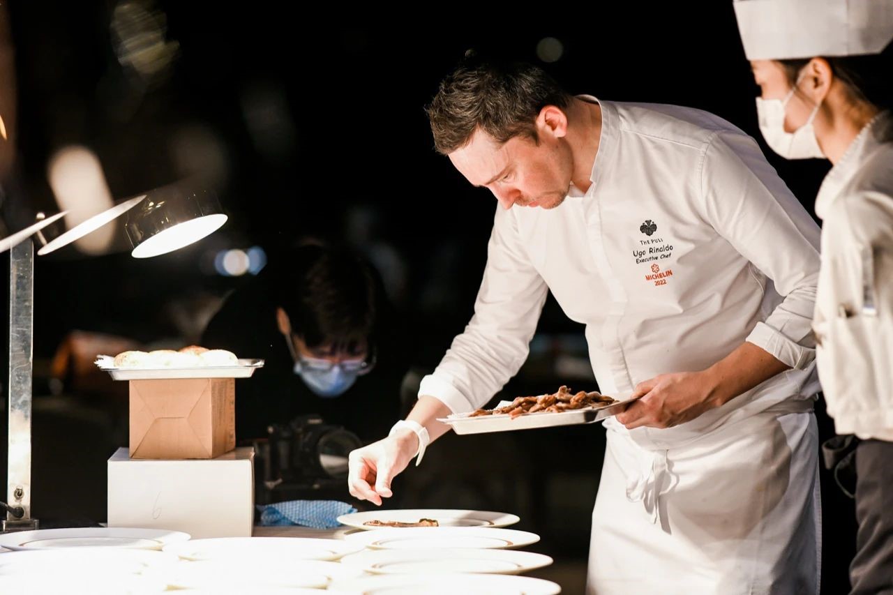 璞丽酒店的行政主厨Ugo Rinaldo为2022秋食记研发了头盘、主菜和甜点等一整套完整的跨界经典法餐,包括:在招牌的鱼子酱黄尾鱼头盘中,加入了新鲜手剥淀山湖河虾仁和芦笋;用青浦本地鸽重新演绎法餐名菜油封鸭肝乳鸽;采用国家地理标志的今年度白鹤头茬草莓结合白巧克力制成清甜奶冻,搭配水乡特色鸡头米,组合成轻盈酸甜的草莓挞。