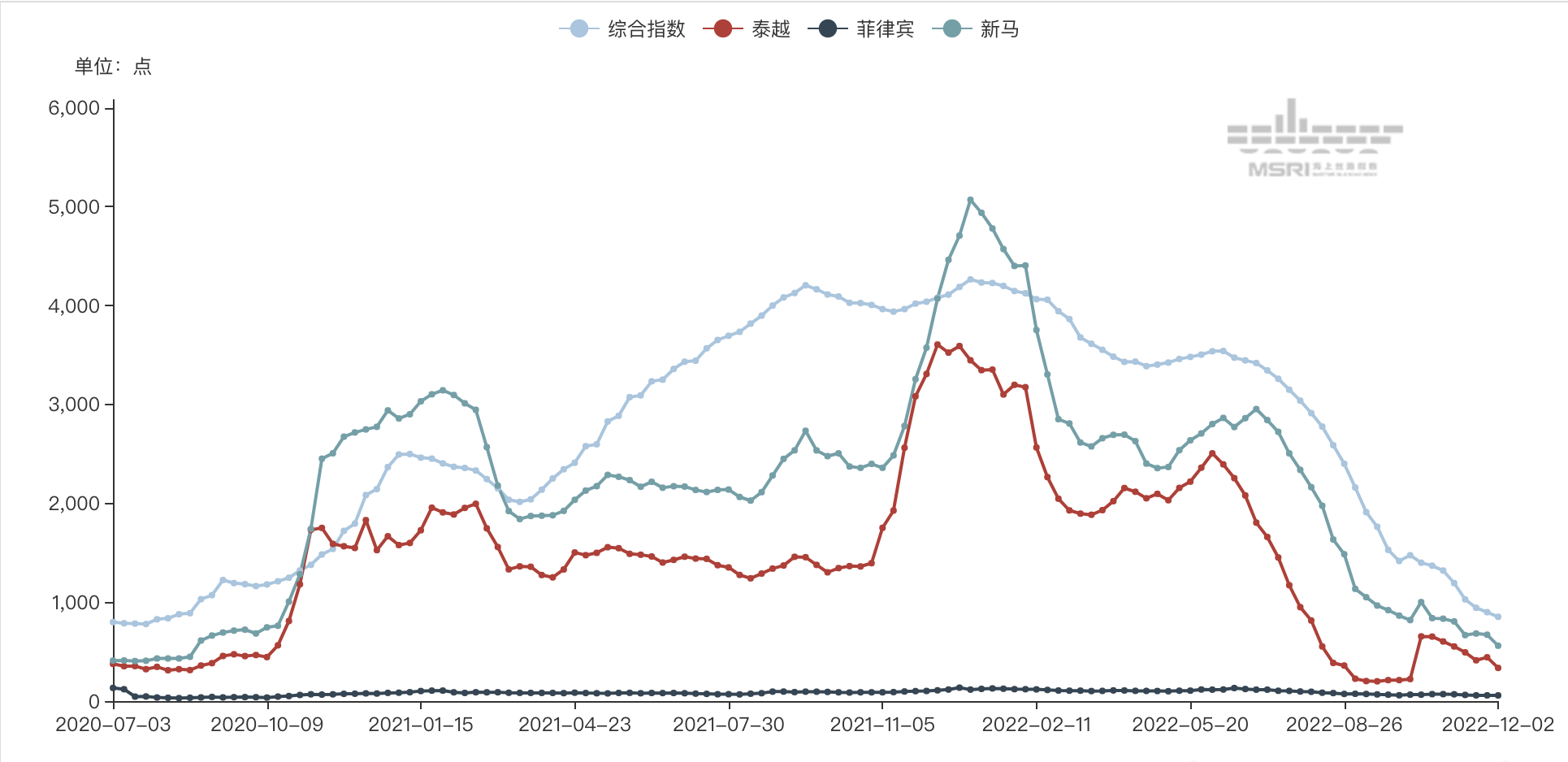 根据宁波航运交易所近日发布的“海上丝绸之路指数”,11月26日至12月2日泰越航线运价指数为335.4点,较上周下跌24.3%。报告指出,泰越航线运输需求疲软,班轮公司纷纷以降价为主要手段加强揽货,即期市场订舱价格跌幅较大。