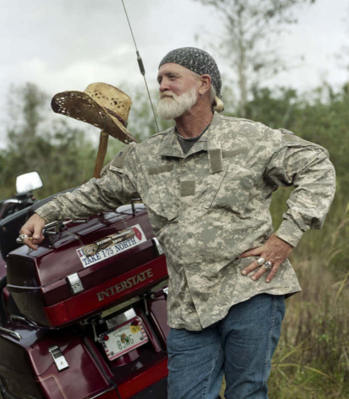 他生长于奥兰多,目前定居在布鲁克林。大沼泽地国家公园一直吸引着他,“这里就像是以前的西部蛮荒地区,人们四处逃窜,随时随地都充满着致命的危险,”他说到,“但同时又是那么地美丽迷人。”当他在2012年底第一次听到“捕蟒挑战大赛”时,他决定一探究竟。
