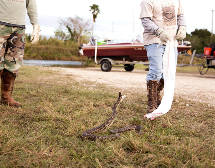 在一个月的时间里,当地有关部门给“捕蟒猎手”划定了160万英亩的沼泽和锯齿草地,让他们“搜捕”蟒蛇,并且允许以仁慈的方式来杀掉这类有危害的物种。虽然听起来就如同是在寻找偏远地区的矿藏一般,但猎手们还是对这项环境保护工作充满着热情。“这当然是一件很酷的事情,因为你帮忙抓到了这种疯狂的动物。但其实他们只是对这项比赛本身更感兴趣而已。”摄影师迪伦·庄士敦(Dylan Johnston)说到。