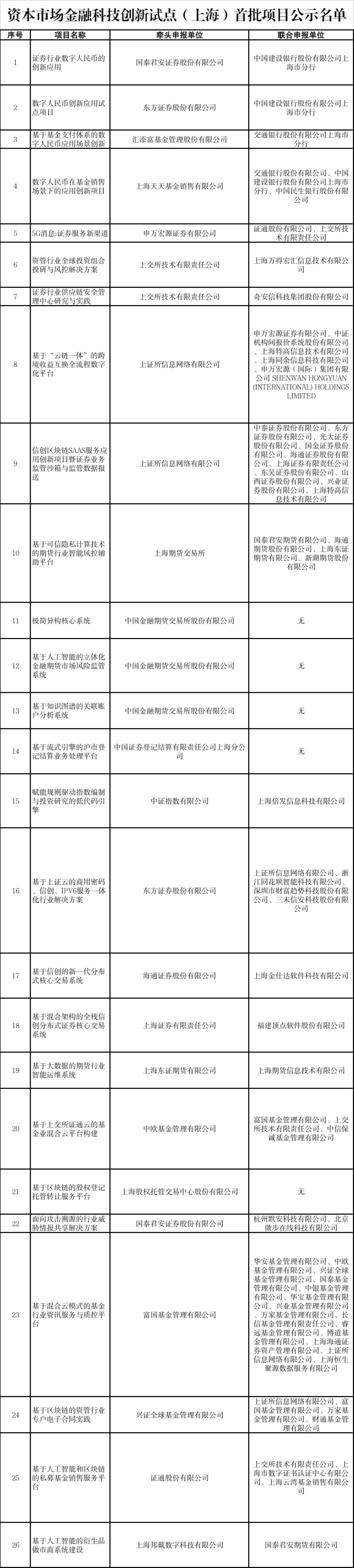上海金融官微消息,12月8日,资本市场金融科技创新试点(上海)专项工作组发布公示通知:为推动证券期货行业金融科技稳妥发展,促进资本市场数字化转型,完善资本市场金融科技监管机制,2021年10月,中国证监会支持在上海启动资本市场金融科技创新试点工作。截至目前,26个申报项目已通过项目征集、遴选评审、专业评估等环节,拟纳入本市首批资本市场金融科技创新试点,现就相关项目方案向社会进行公示。公示时间:2022年12月8日-12月14日。