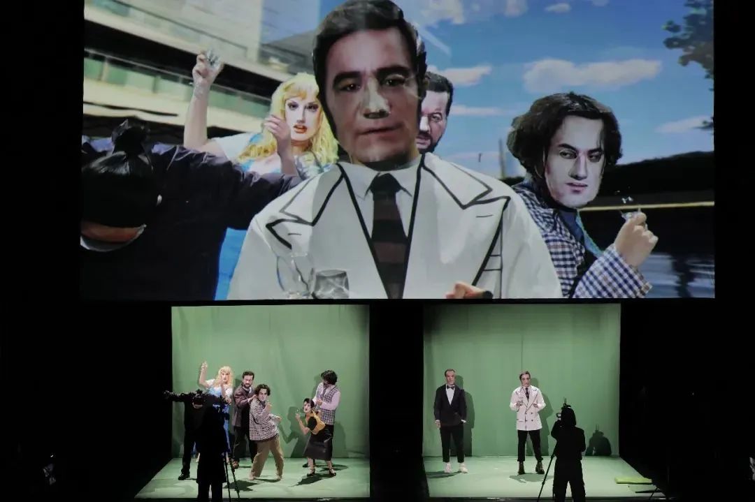 施蒂勒不时陷入虚无般的眩晕之中,似乎一切都失去了意义。作为电子元件的施蒂勒一边徒劳地寻找真相,一边躲避老板的追踪。电影结尾,施蒂勒面临着一个存在主义式的抉择:是离开这个虚假的世界,还是和公众说出老板的阴谋?在话剧版本中,李建军借助即时投影与绿幕抠像技术,打破了舞台的时空局限,观众的视线将在屏幕和舞台两者之间来回穿梭,与原作质询何为真实、何为虚假的寓意相呼应。