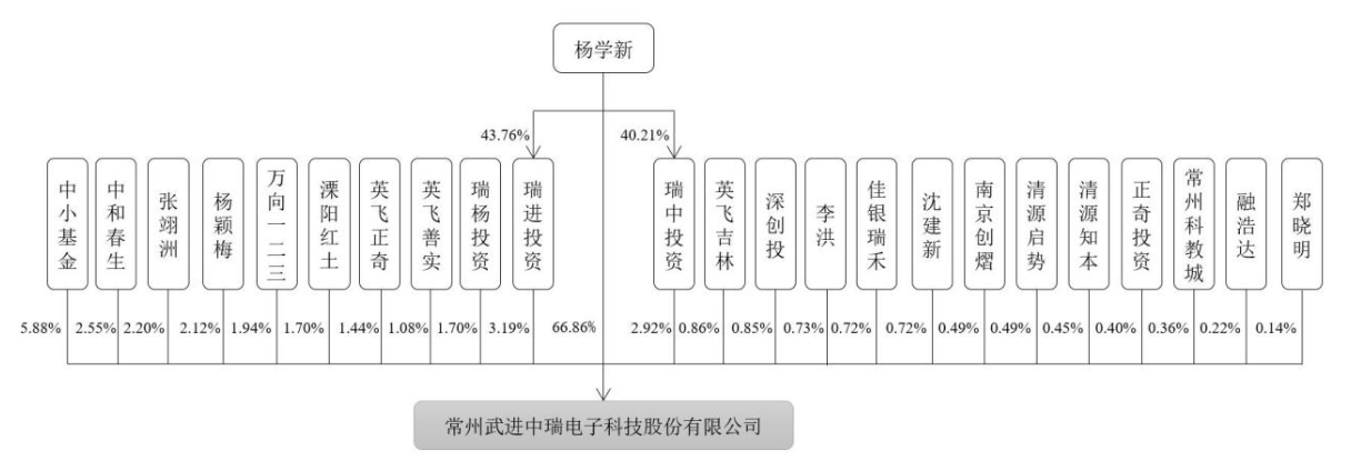IPO前,中瑞电子的控股股东及实际控制人为杨学新,其直接持有公司66.86%的股权;通过持股平台瑞进投资、瑞中投资间接持有公司2.57%的股权,因此合计持有69.43%的股权。