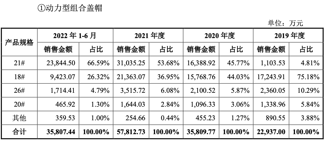 从产品结构来看,报告期内(2019年-2022年上半年),中瑞电子收入增长得益于动力型组合盖帽尤其是18#和21#两个系列,其中21#在2020年之后逐渐成为公司业绩的支撑点。需要说明一点,近年来,圆柱电池领域出现了“18650 电池—21700 电池—4680 电池”的尺寸容量扩大趋势,前两个分别对应公司的18#和21#。