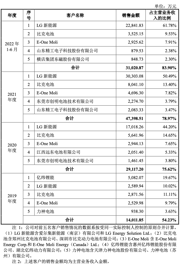 界面新闻记者注意到,中瑞电子与比克电池的合作并未就此结束。2020年-2022年上半年,比克电池均为中瑞电子第二大客户,销售额分别为5641.96万元、8041.10万元、3525.15万元,销售占比分别为14.65%、13.40%、9.53%。