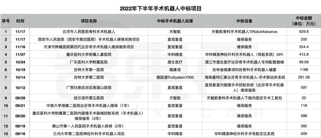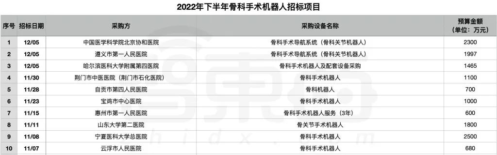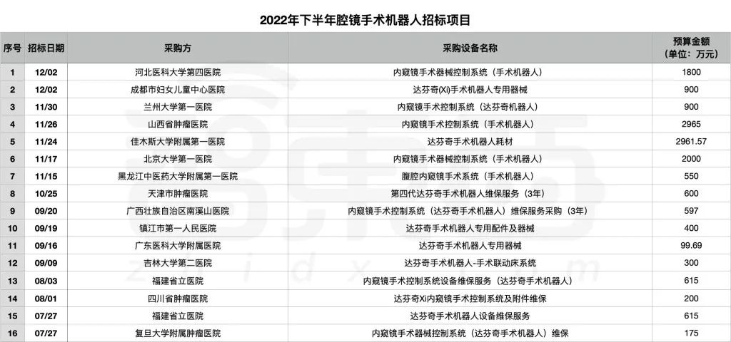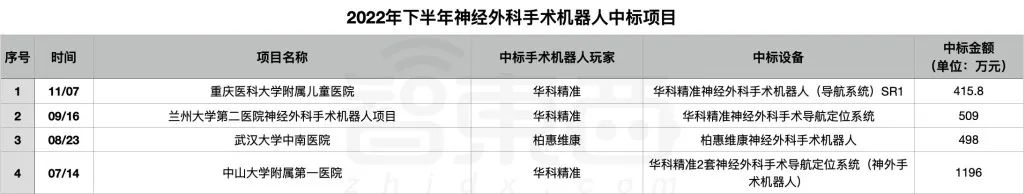 ▲2022年下半年手术机器人中标项目统计表(数据来源:中国政府采购网)