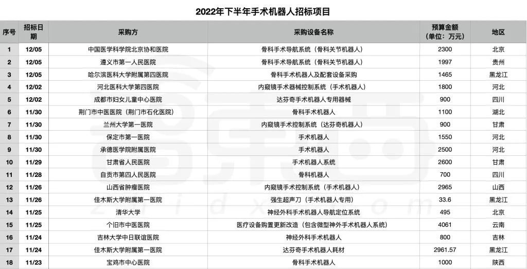 ▲ 2022年下半年手术机器人招标项目统计表(数据来源:中国政府采购网)