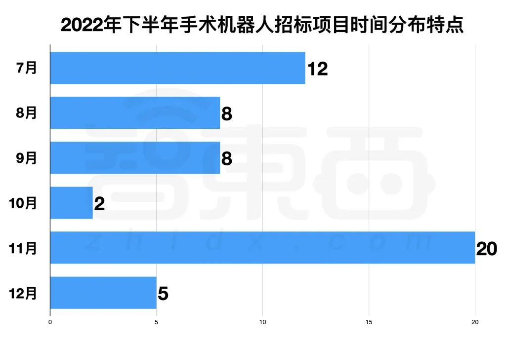 据智东西统计,2022年下半年手术机器人中标公告达到34个,其中达芬奇手术机器人相关中标公告为20个,直观复星一家独占17个,其余三个则为相关手术床、手术机器人耗材等配套设施。