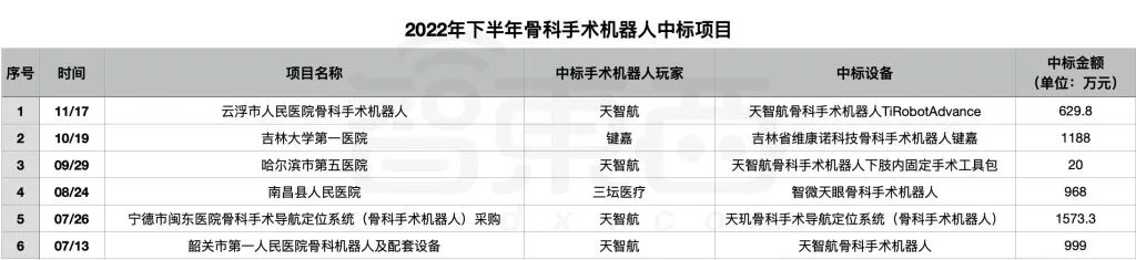 骨科机器人的中标项目有6个,其中天智航中标4个,中标金额在600万元~1500万元之间。