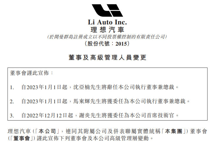 港交所公告显示,理想汽车总工程师马东辉将接替沈亚楠担任理想汽车总裁并进入董事会,整体负责研发和供应链群组。高级副总裁谢炎将出任理想汽车CTO,全权负责系统与计算群组。
