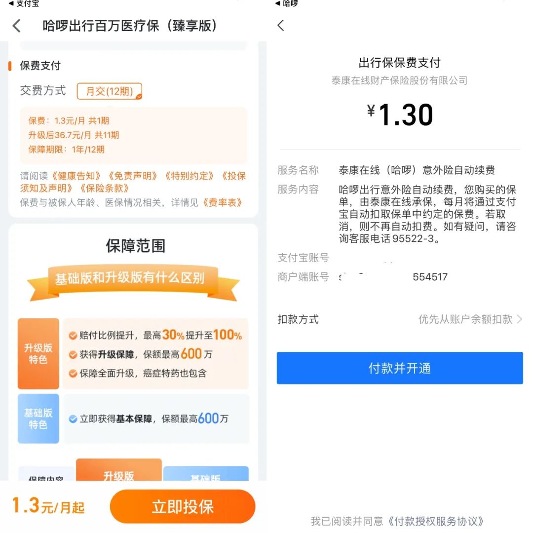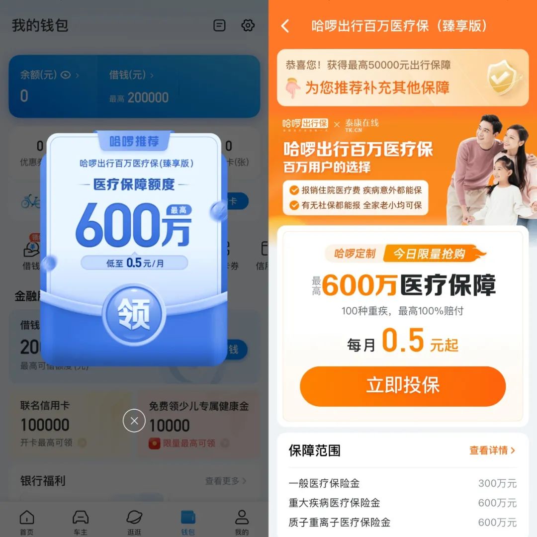 在免费领取之后,哈啰出行再次通过页面弹出广告等方式,向笔者营销“哈啰出行百万医疗保(臻享版)”。这款保险宣称保障额度最高600万元,保费低至每月“0.5元起”。
