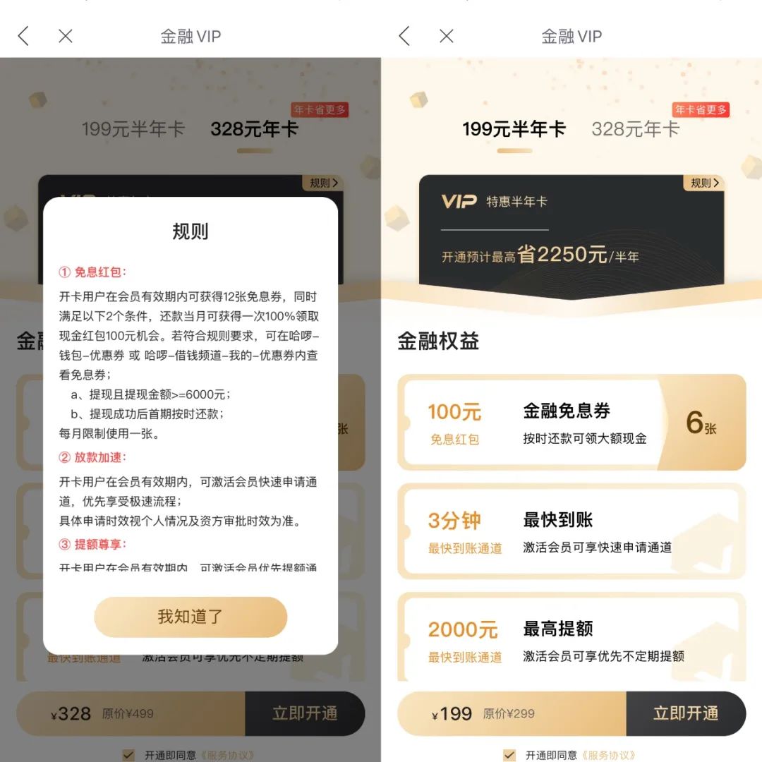 除此之外,臻有钱还在APP内向用户兜售金融VIP会员卡。其中,半年卡199元,年卡328元。购买会员卡后,用户可以享受到免息红包、放款加速、提额尊享等权益。同样,开通即默认同意《服务协议》。根据协议,会员卡是哈罗出行联合上海及未科技有限公司推出的服务。后者是一家金融科技公司,关联基金销售和保险经纪牌照。