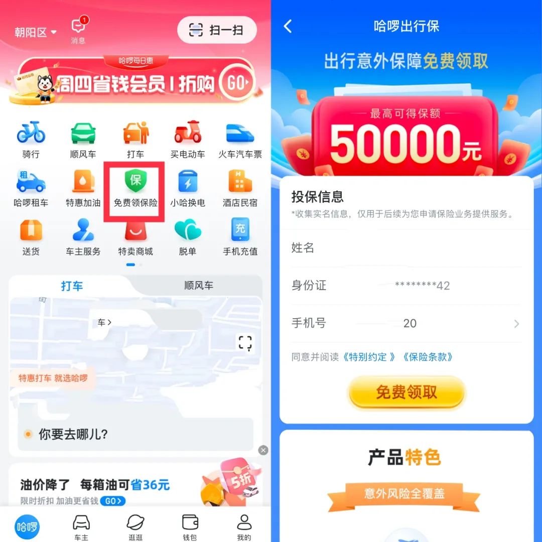 不过,没有牌照并不妨碍哈啰出行继续开展保险业务。在哈啰出行APP首页核心位置,“免费领保险”的字样赫然在列。
